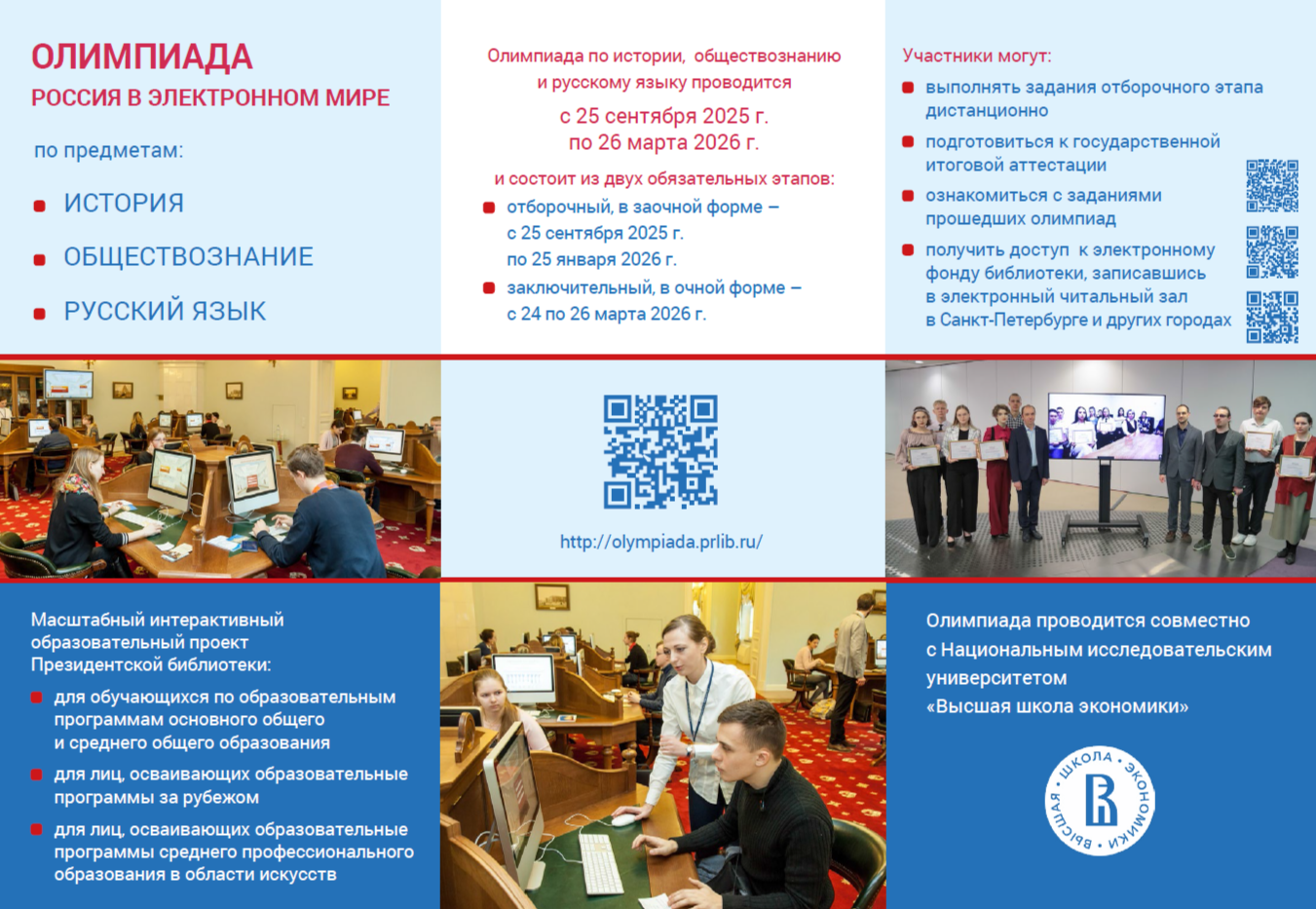 Президентская библиотека совместно с НИУ «Высшая школа экономики» проводит олимпиаду школьников «Россия в электронном мире» (далее – Олимпиада) с целью формирования у подрастающего поколения углубленного интереса к истории России и русскому языку, чувства ответственности за сохранение и развитие российской государственности; выявления молодых талантов в области изучения гуманитарных дисциплин, а также создания необходимых условий для поддержки одаренных детей.
